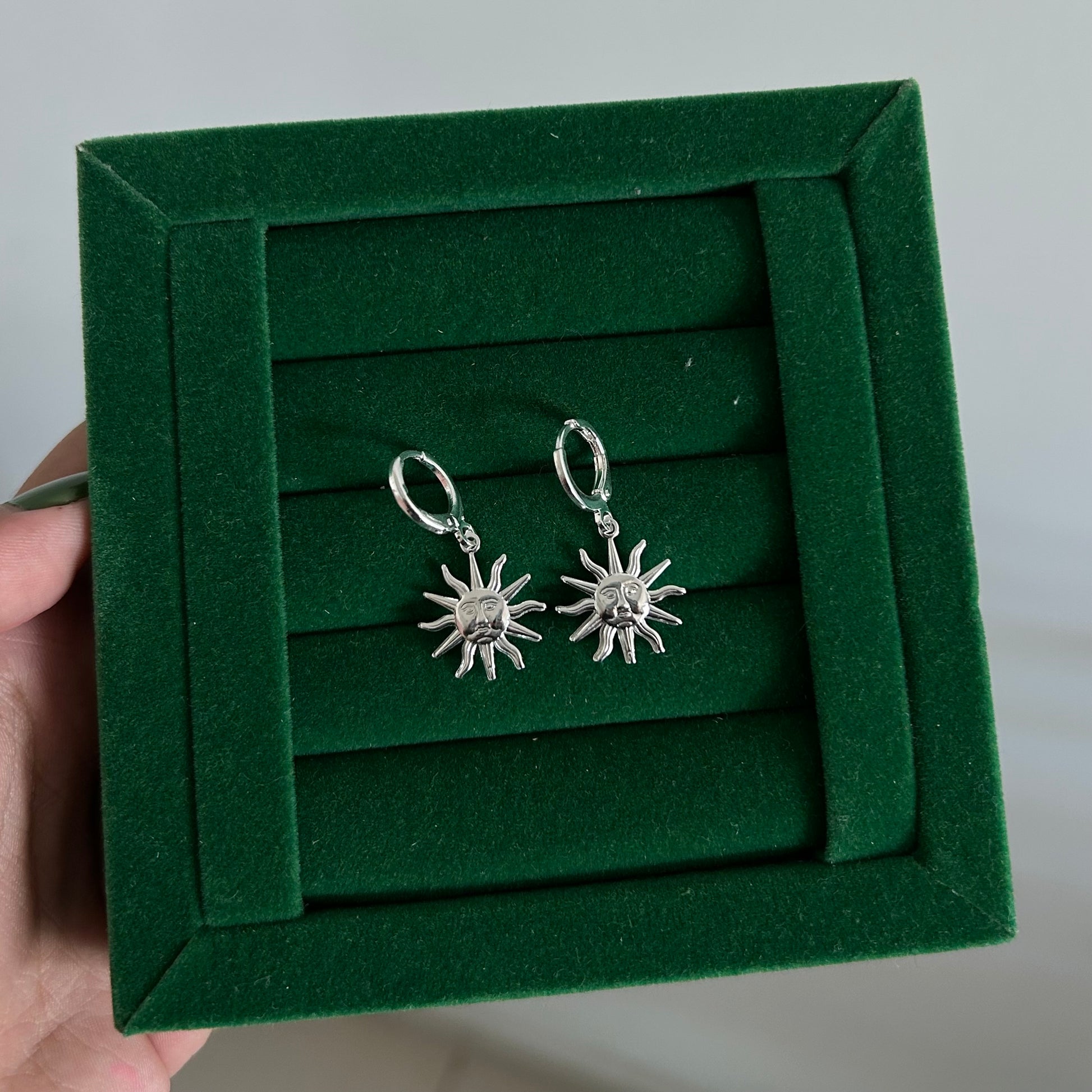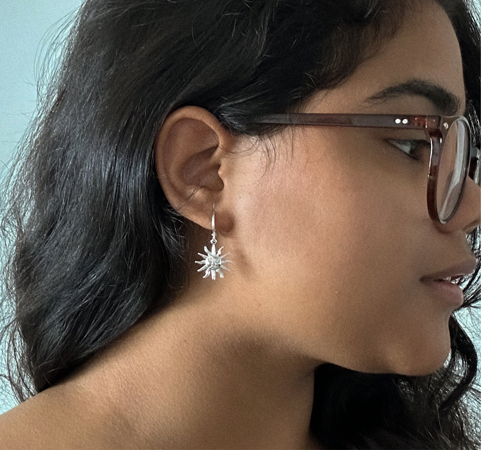 Par de argolas com fecho click e pingente de sol em cada lado.